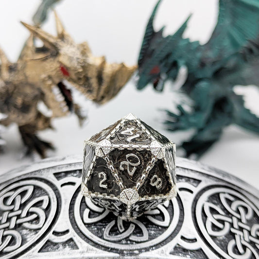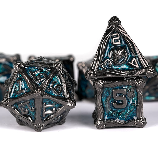 Metal Solid Dragon And Warrior Dice Set, Black Nickel Blue