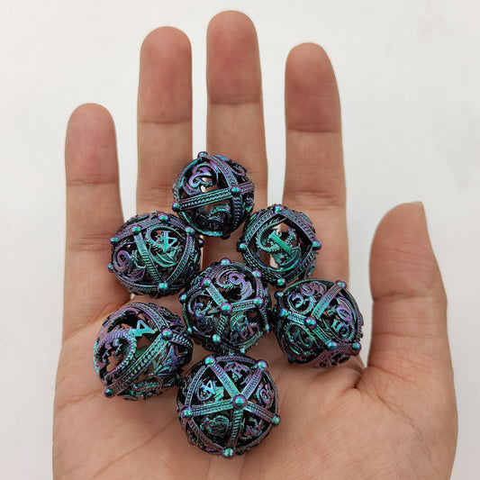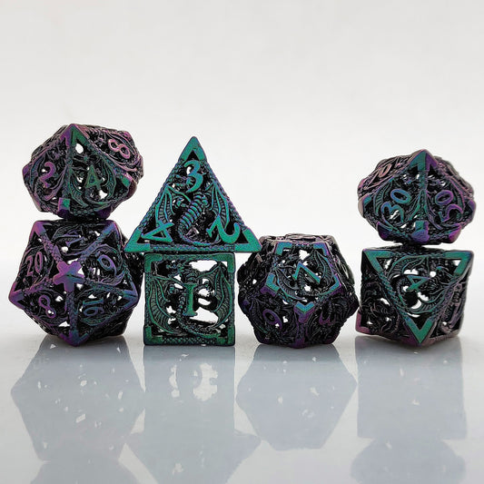 Juego de 7 dados de metal huecos de pterosaurio, degradado verde y morado