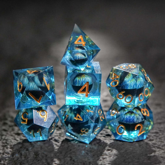 Juego de dados de resina con forma de ojo de dragón, números azules y dorados