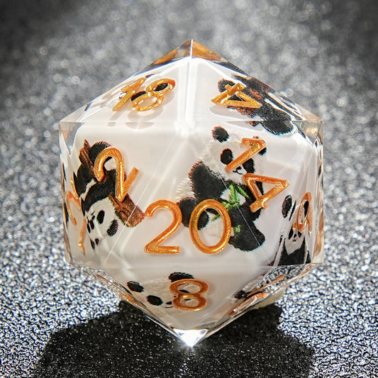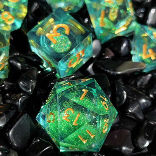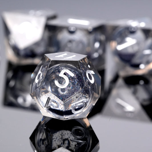 Juego de dados de resina con núcleo líquido, números negros y plateados