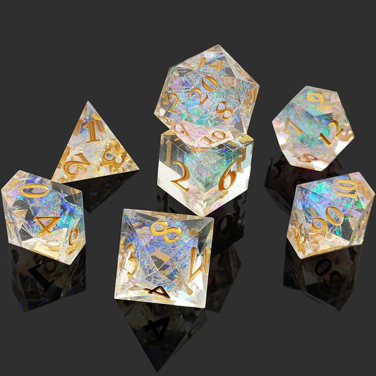 Juego de dados de resina con borde afilado, flor transparente y números dorados