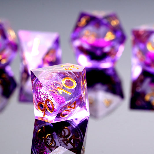 Juego de dados de resina con núcleo líquido, morado y números dorados