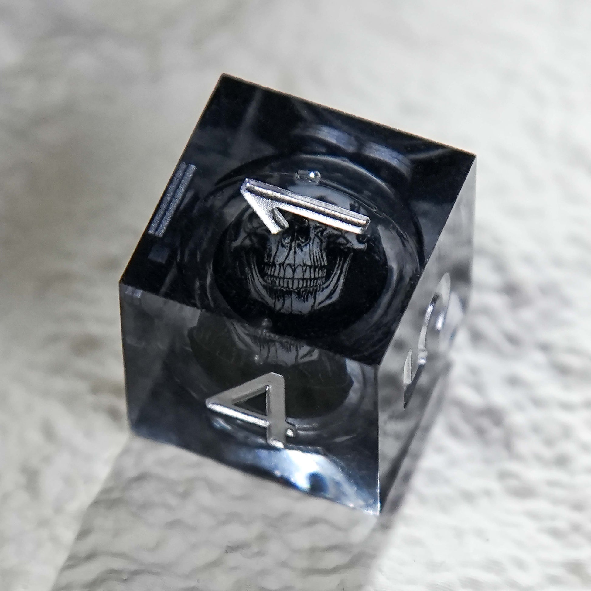 Juego de dados de resina con núcleo de calavera, números negros y plateados