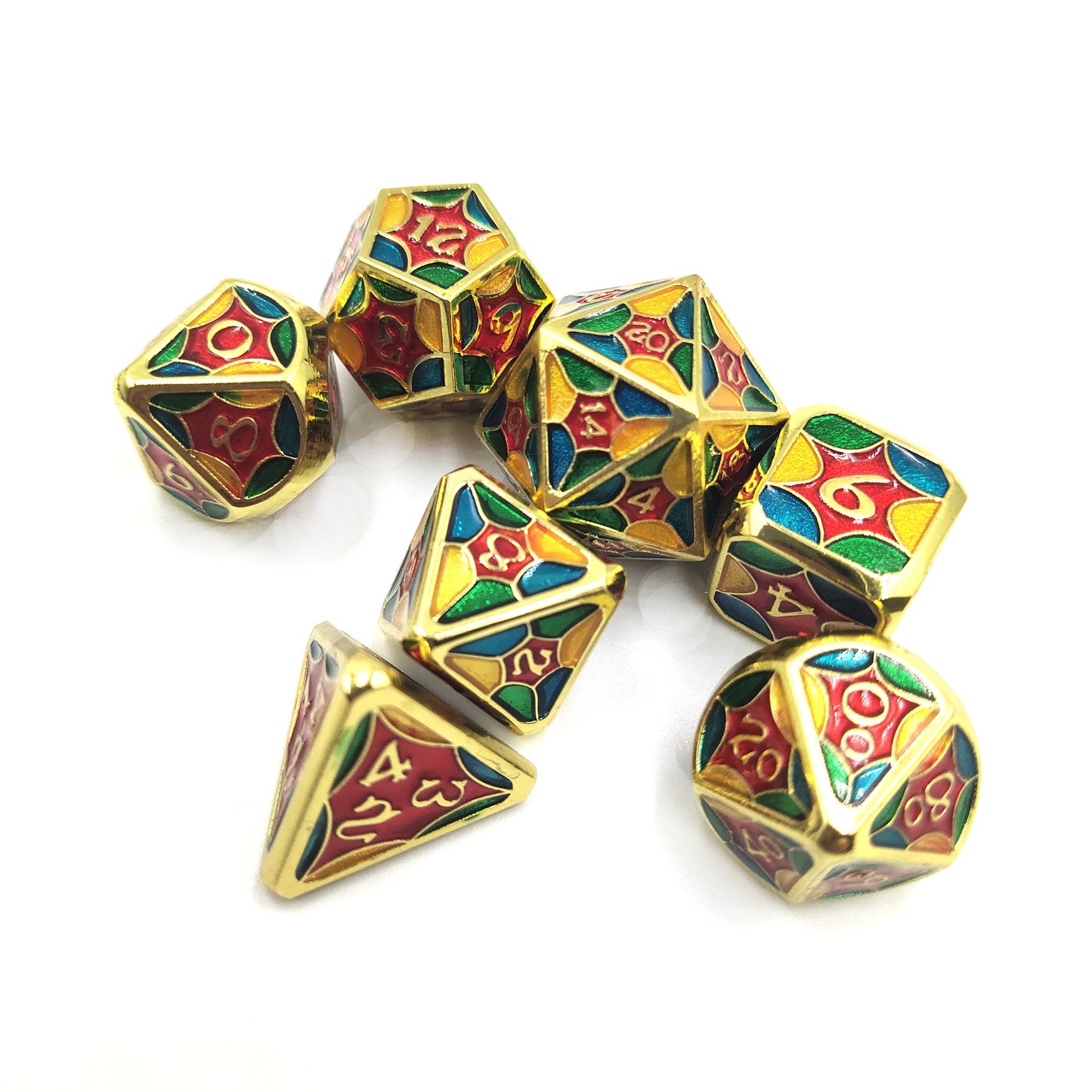 - [Design of The Dice]: These solid metal dice are made form classic craft, each dice has petals and different colors, very elegant and dynamic. Rounded corners design, very nice hand feeling, well balanced and easy to roll. 117g weight with heavy feeling and good rolling balance, bringing you a different experience, a gift worthy of collection.